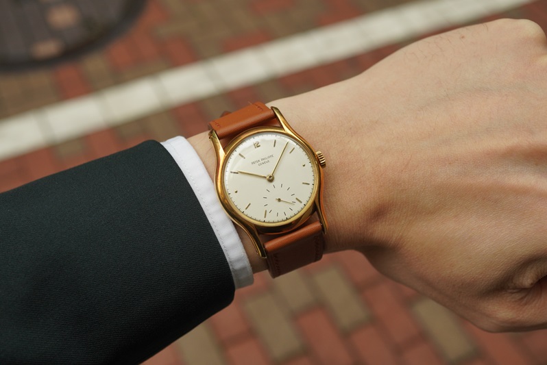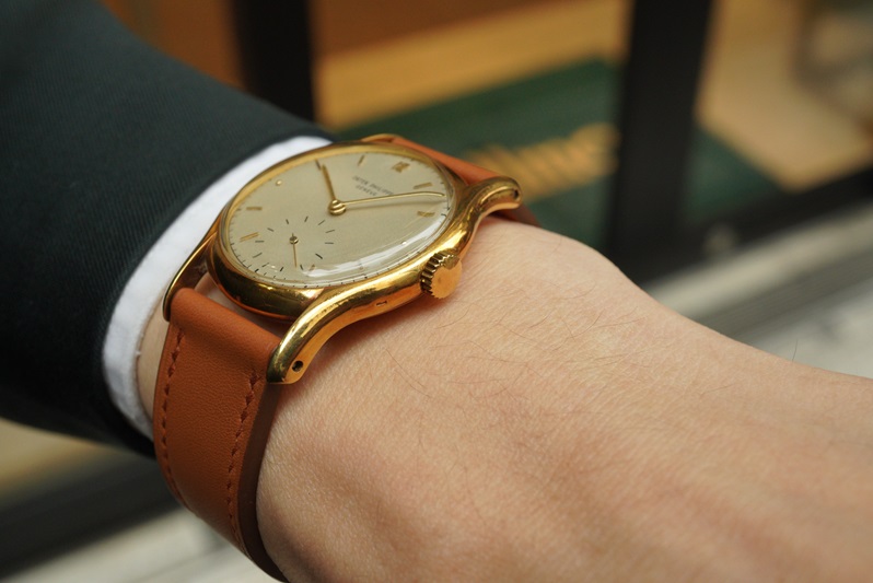 独特のケースデザインが特徴的なRef.2406。一見はよくあるパテックのドレスウォッチではありますが、いざ手に取って見るとその柔らかな流線型のケースラインは、エッジの立った重厚感のあるケースデザインの多いカラトラバ等とは大きく異なる印象を受けます。