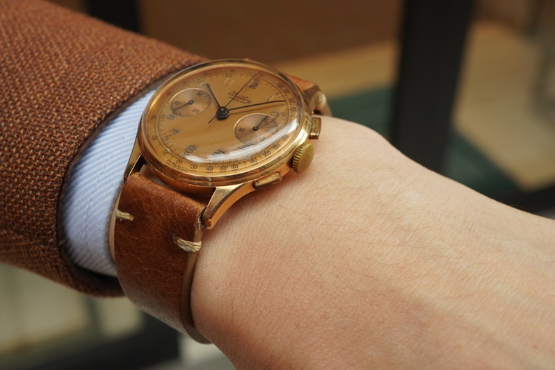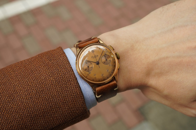 文字盤のすこし枯れたような風合いも良いですね。ちょっとハバナカラーっぽい感じがブラウンのジャケットによく合います。暑い夏が終わり、秋冬の到来を感じる今この瞬間に腕に乗せたくなる一本です。