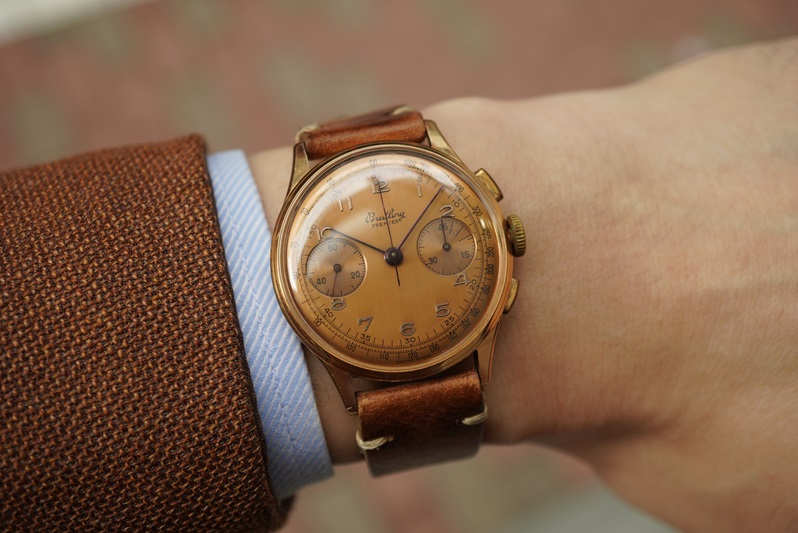 個人的にブライトリングは好きなブランドなので、えこひいき的に当ブログでも隙を見てはご紹介させて頂いています。今日のプレミエもかなり好みな顔つきです。18Kピンクゴールドのケースに程良くエイジングされたカッパーのダイヤルが洒落ています。