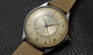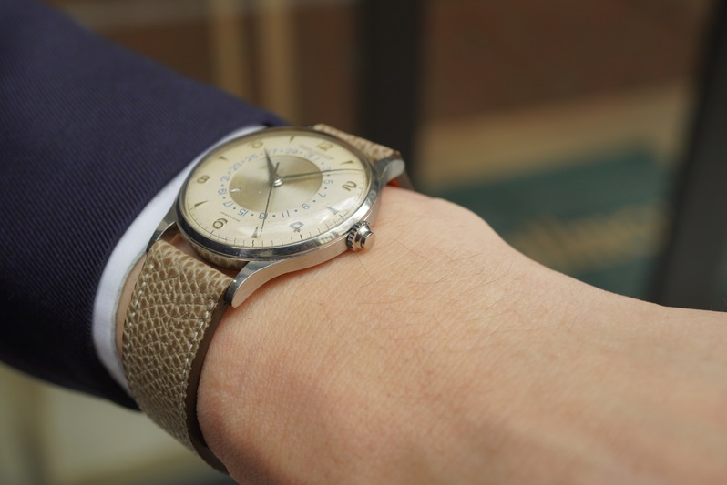 ディスク式カレンダーを用いたダイヤルデザインがユニークな一本。アラビアとクサビのインデックスの組み合わせはいかにも50年代らしいテイストです。ディスクカレンダーを設けることで、2トーンダイヤルの様にも見え、ダイヤルの凝縮感や均整を高めるのにも一役買っています。