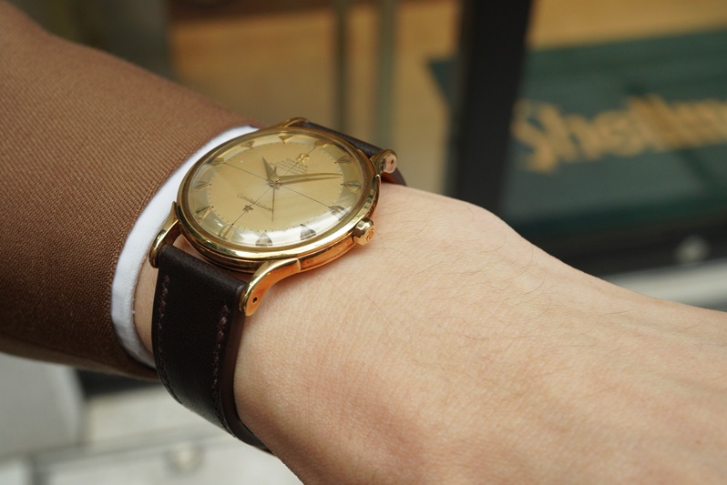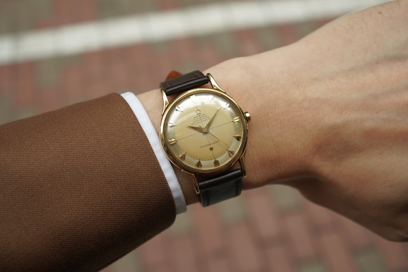 今回の個体は50年代の14Kイエローゴールドケース。60年代頃の”12角”に通ずるデザインではありますが、よりドレッシーな雰囲気に個人的にそそられます。クロスラインが施された2トーンダイヤルは、ゴールドケースならではの豪奢な雰囲気の中にもどこか精悍さを感じさせてくれます。加えてドルフィン針と多面カットが施されたクサビ型のインデックスは重厚感と立体感を併せ持ち、オメガのフラッグシップモデルに相応しい作り込みがご堪能頂けるでしょう。
