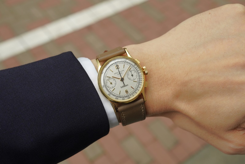クラシックな意匠の角型プッシャーが、クロノグラフでありながらもドレッシーな印象に。