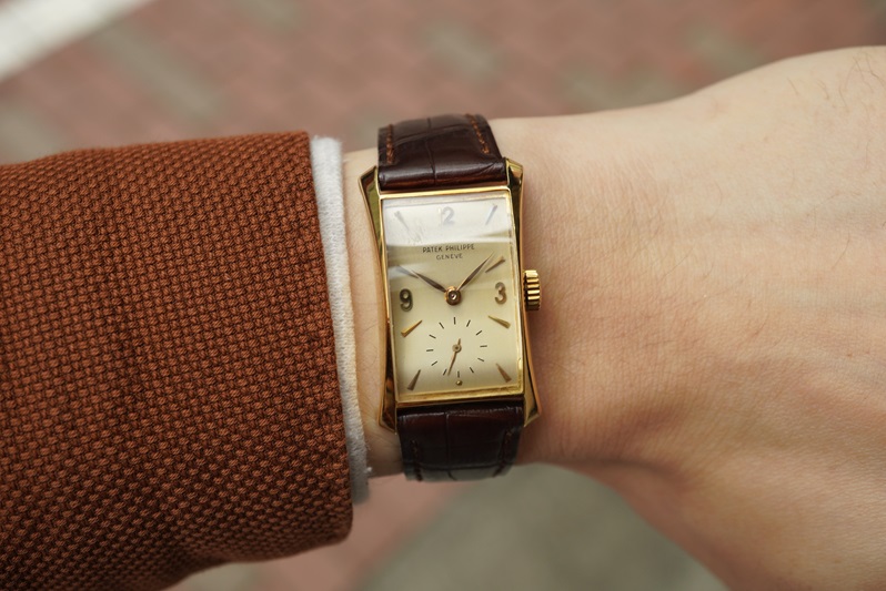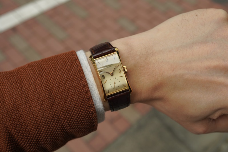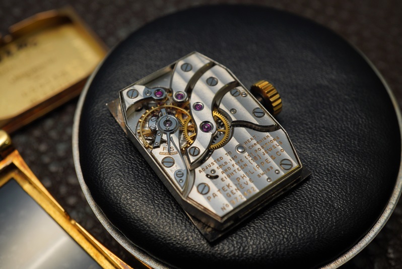 パテック・フィリップ製角型手巻Cal.9-90を搭載。9-90は30年以上に渡り製造されたベストセラームーブで、後年はチラネジからジャイロマックステンプに変更されるのですが、個人的にはこのクラシカルなチラネジテンプが好み。