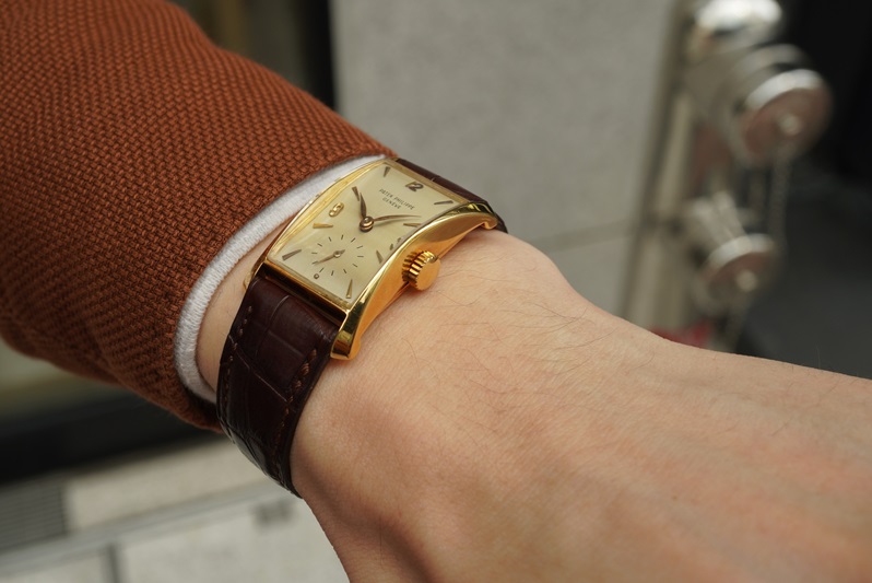 50年代のパテックを代表するフレアードデザインのRef.2468。フレアードの代表作であるRef.1593をやや小ぶりにしたようなデザインで、上下に広がる様に曲線を描く美しいケースラインはラウンドの時計には無い優雅さを生み出しています。