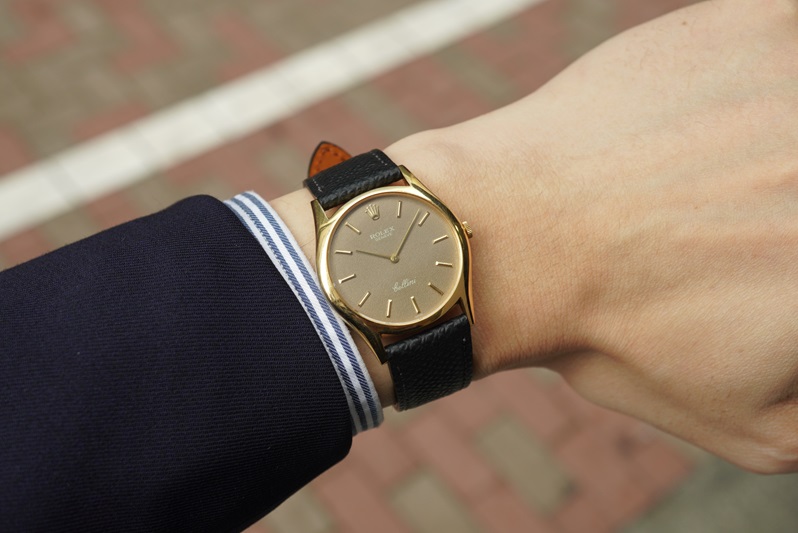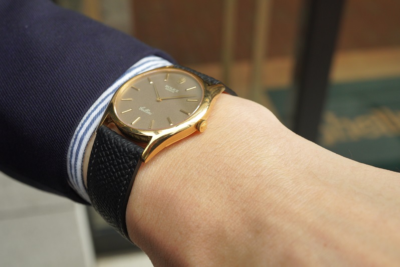ダイヤルカラーに併せてグレージュのような色味のベルトに代えても良いかもしれません。メリハリは失われますが、ちょっとニュアンスカラーで全体を纏めたい時にマッチするんじゃないかなと。秋冬の装いには合わせやすいかと思います。