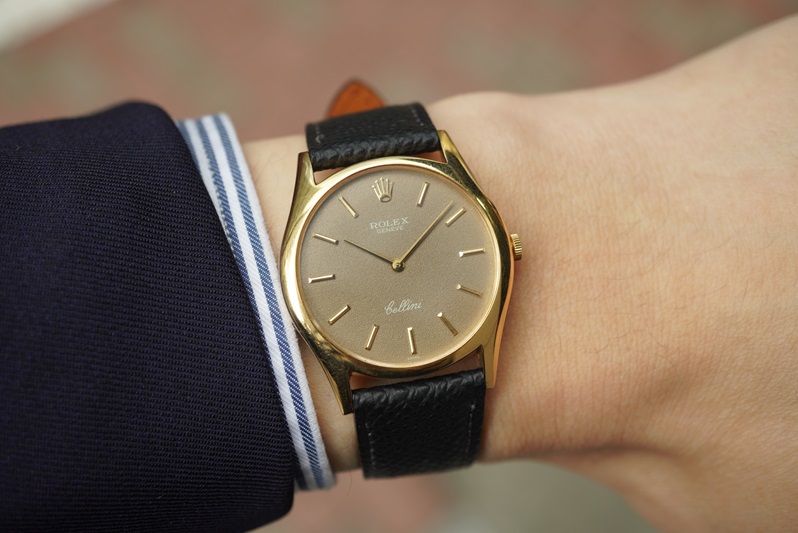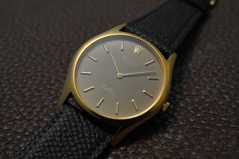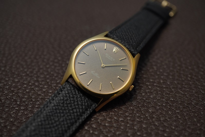 今回のチェリーニは少し前に自分が仕入れた時計でして、年始のバタバタで撮影するのを忘れていました。なんといっても文字盤ですね。薄いブラウン系のダイヤルにレタリングはホワイト。所謂ゴーストダイヤルの系統です。チェリーニでこの文字盤はかなりレアでして、仕入れの場で見つけて即確保した一本です。