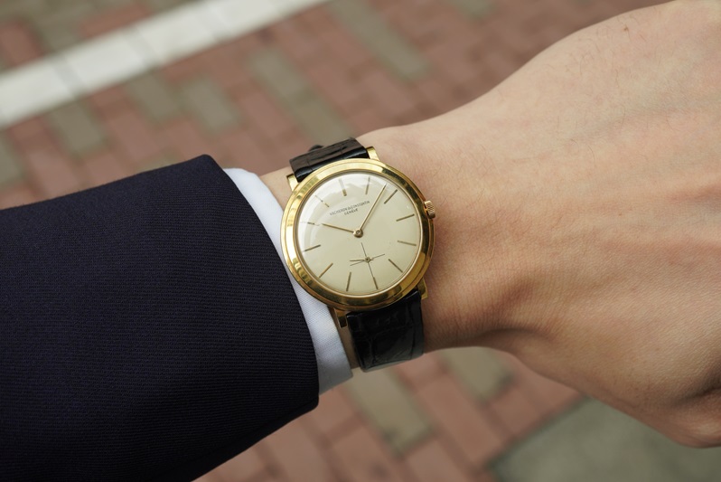一方でケースの厚みは御覧の通り。極薄ですね。袖元にしっかり無理なく収まってくれる、この時代のヴァシュロン薄型ドレスらしい腕乗りです。