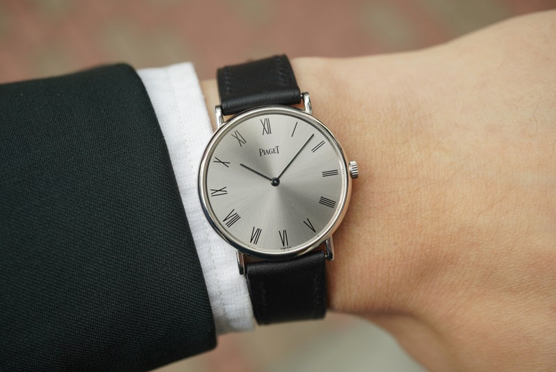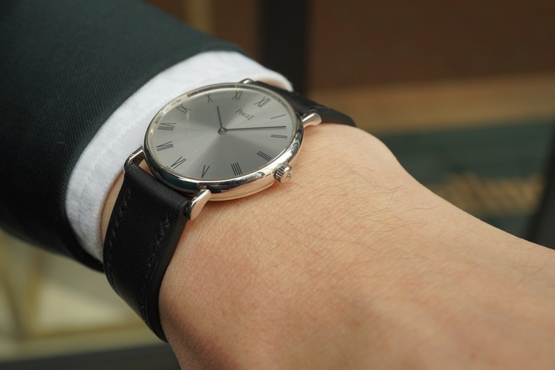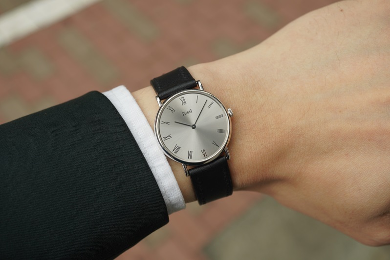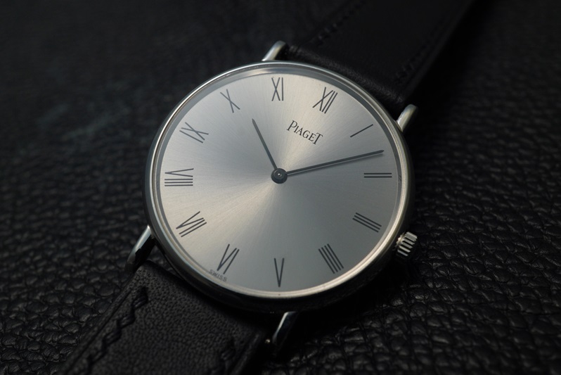 シルバーのサンバーストダイヤルにバーハンドとペイントのローマンインデックスというドレスウォッチとしては王道のデザイン。ピアジェのドレスウォッチと言えばやはりアルティプラノが頭に浮かぶわけですが、今回のRef.9025Nも正にそのテイストを色濃く映す、ピアジェのドレスウォッチらしい佇まいです。