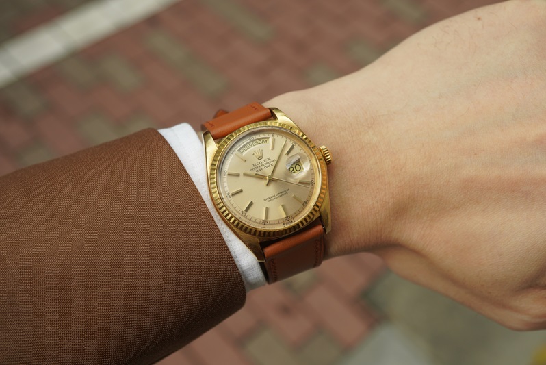 しかし実用時計ブランドの最高峰とも言えるロレックスのデイデイトは、日々の生活の中において実用性・快適性等を十分に担保した上で、ロレックスが提供出来る最大限のエレガンスを生み出している時計だと思っています。デリケートなカラトラバでは日々の生活にマッチしないという人でも、デイデイトであれば自然に腕元に優雅さを生み出すことが出来るのです。