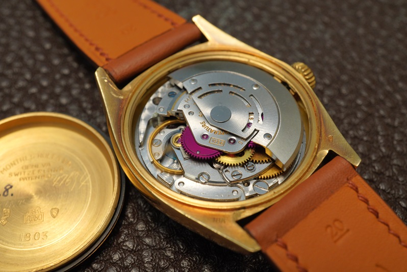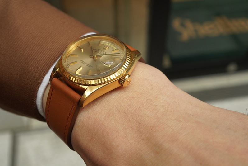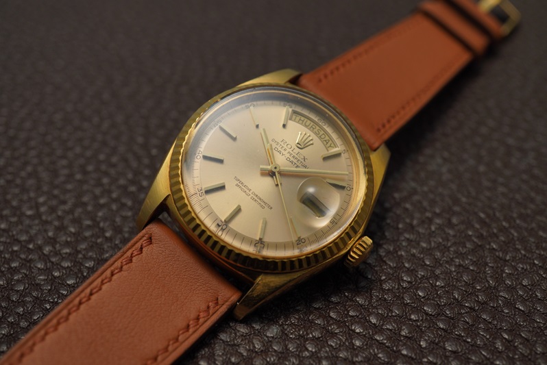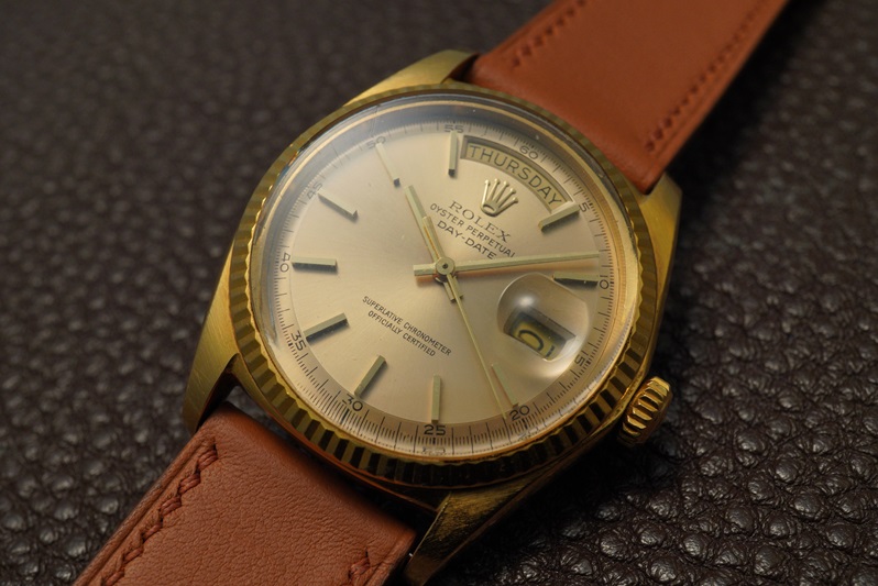 今回の個体は1971年製造の所謂4桁デイデイトのRef.1803。18Kイエローゴールドのケースにシャンパン系のダイヤルカラーを組み合わせたデイデイトでは定番の組み合わせ。一昔前の日本においては決して万人向けとは言い難い雰囲気が有りましたが、いまはこのワントーンのゴールドカラーが個人的にはかなり気分でして、かなり関心を持って見ています。