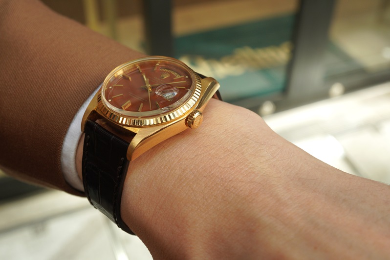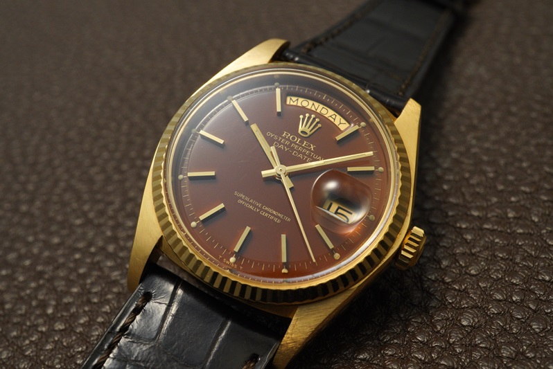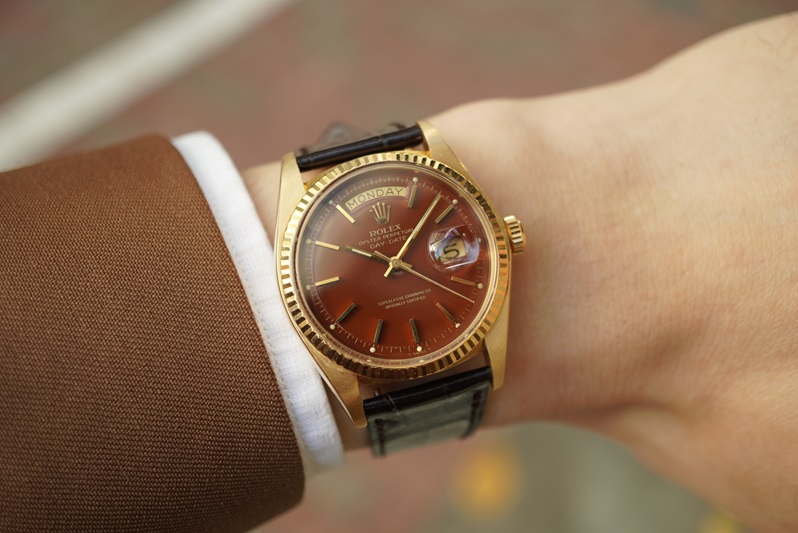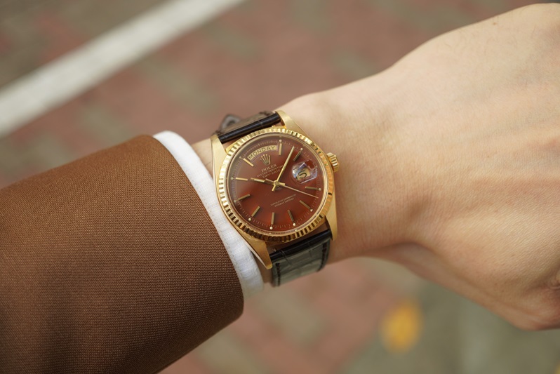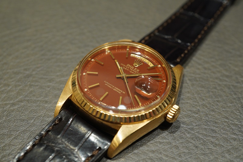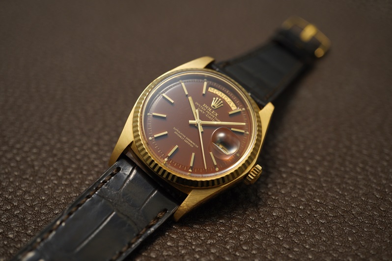 更に今回の個体は海外のコレクターから”Ox Blood(オックスブラッド)”と呼ばれるブラウンとバーガンディーの中間の様なダイヤルカラー。この年代のデイデイトにはブラウンや赤みのあるダイヤルはあまり選択肢がなく、今回の様なテイストのデイデイトは実は希少だと思います。