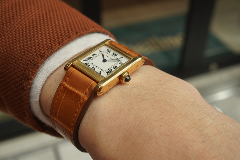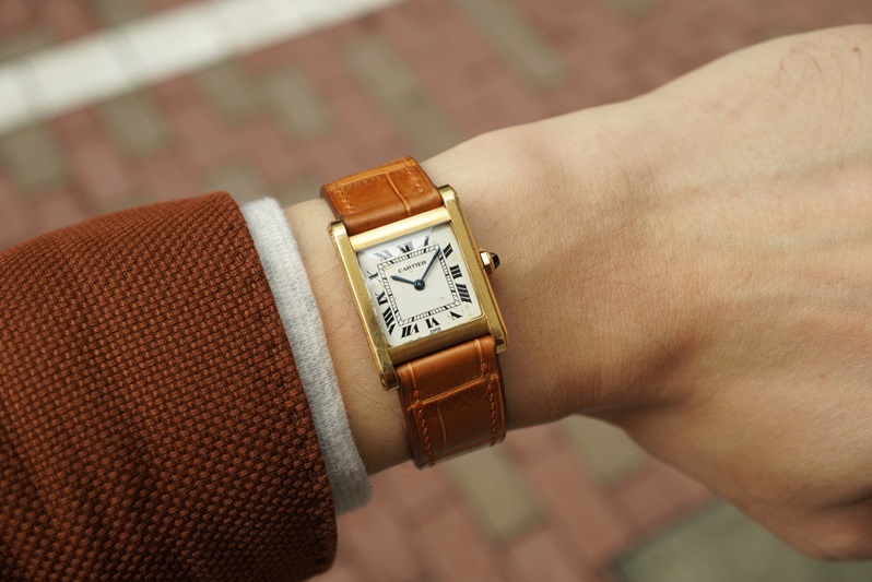 タンクLCと比べて角ばったフォルムは、ドレッシーでラグジュアリーな印象のカルティエのリストウォッチの中でもひと際マッシブな印象を受けます。厚みもしっかりと感じられて、小振りでありながらも存在感のある佇まいに非常に惹かれます。