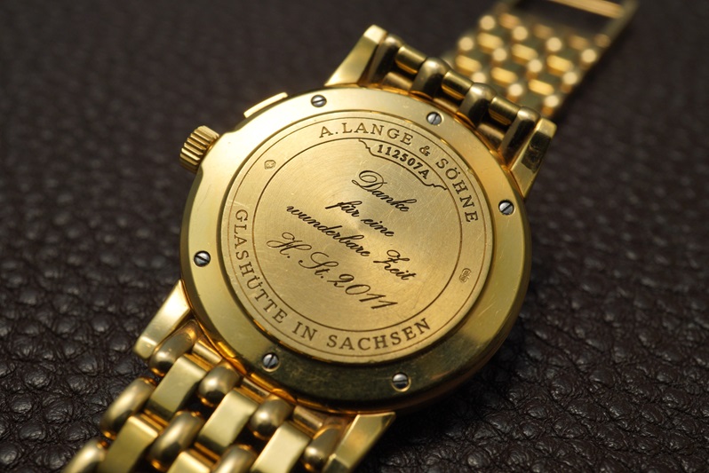 愛好家目線で言えば肝心要のケースバックにエングレービングが入っているのが惜しいところではあるのですが、昨今のランゲのアフターサービスで確か金を盛ってポリッシュとかしてたと思うんですよね。これも例えば金を盛ってエングレービング消せたりしませんかねぇ?この辺ランゲに詳しいお客様に聞いてみたいところです。