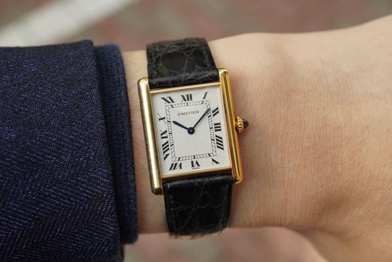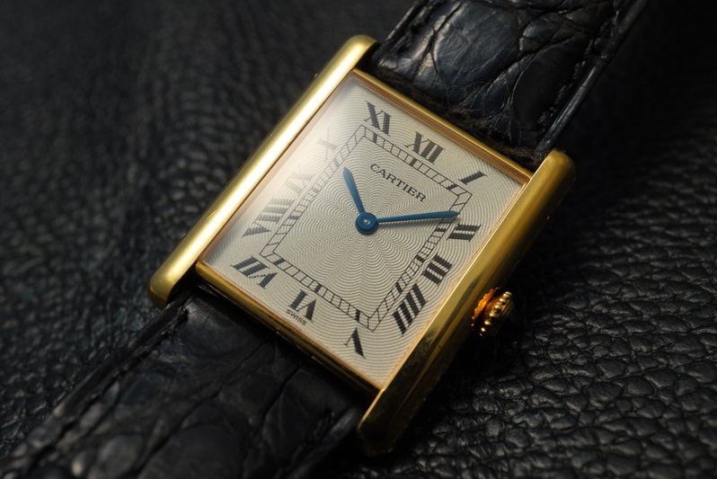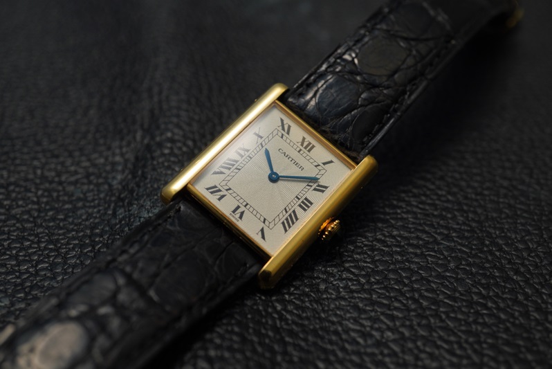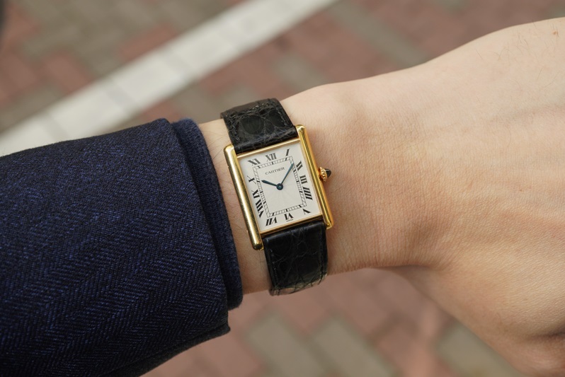 通常のタンクと比べて薄型のケースが生み出すドレッシーな佇まいは、数多くのバリエーションを持つタンクの中でも最もカルティエらしさを感じさせます。