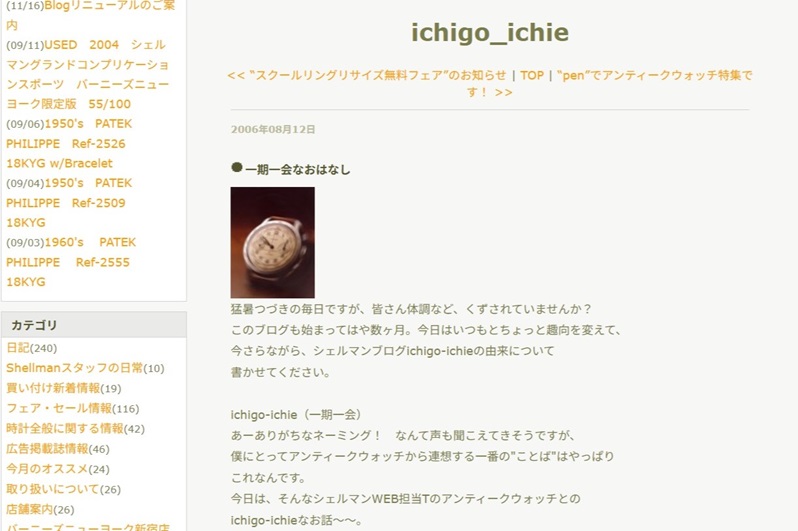 さて単なるお知らせだけでも面白くないのでちょっとしたお話を。上の画像は現在のichigo_ichieになる前に運営していた旧ブログです。実はリニューアル直前には私も何件か投稿をしておりまして、自分の投稿については今見ると中々に恥ずかしいクォリティーではありますが、入社初期に任された仕事だったこともあり私の時計屋としての原点とも言えます。