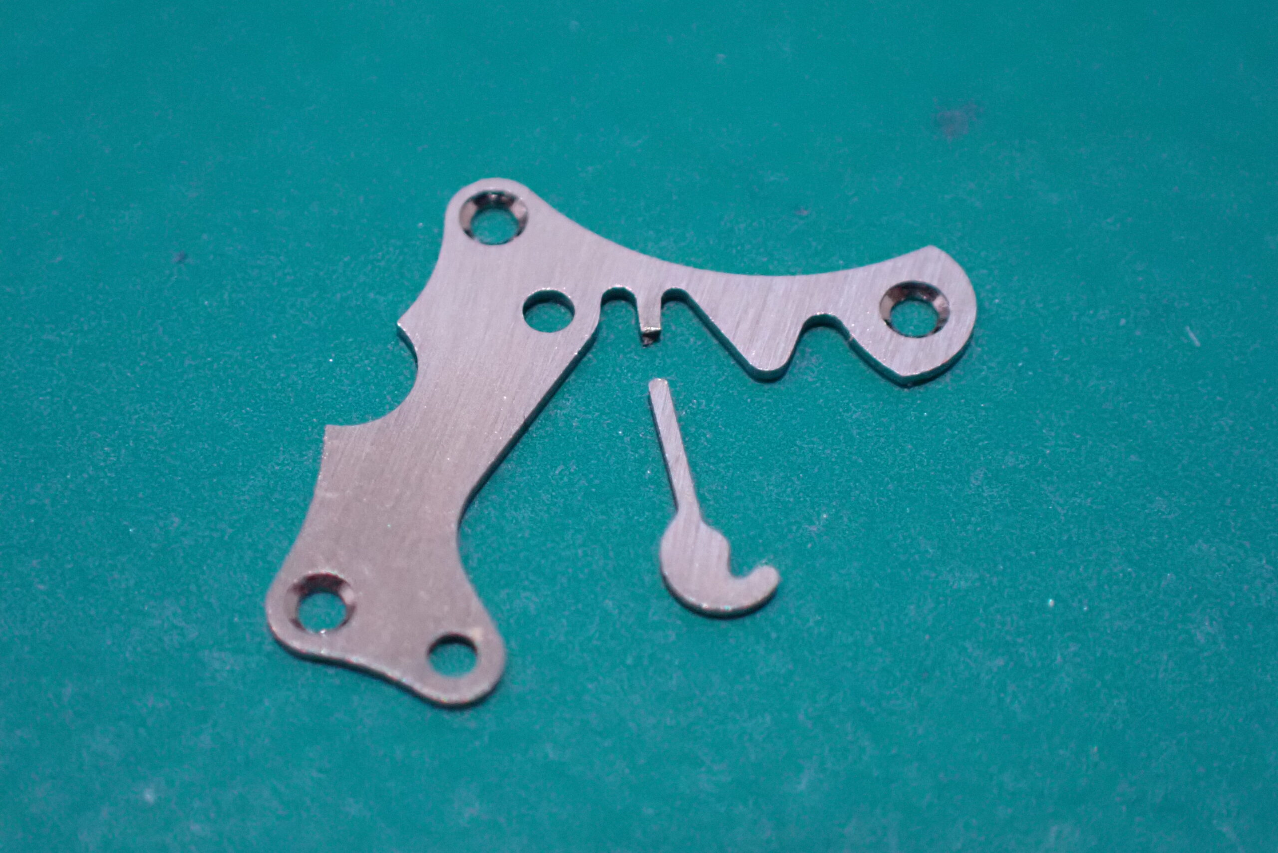 これは裏押さえではありませんが、パテックフィリップのCal.12-600ATに使われている、同じくリューズの押し引きのクリック感を作るパーツです。これも根元が折れていますよね。高級仕上げの施されている高品質なパテックフィリップでもパーツの破断は起こります。