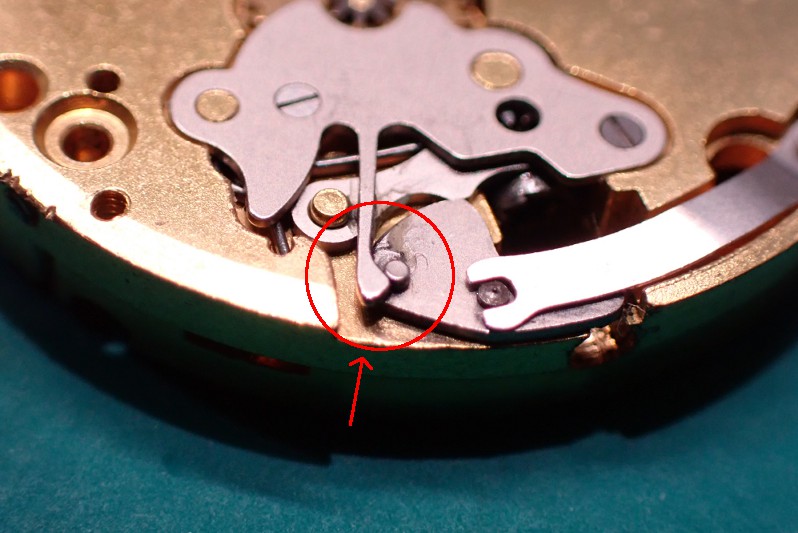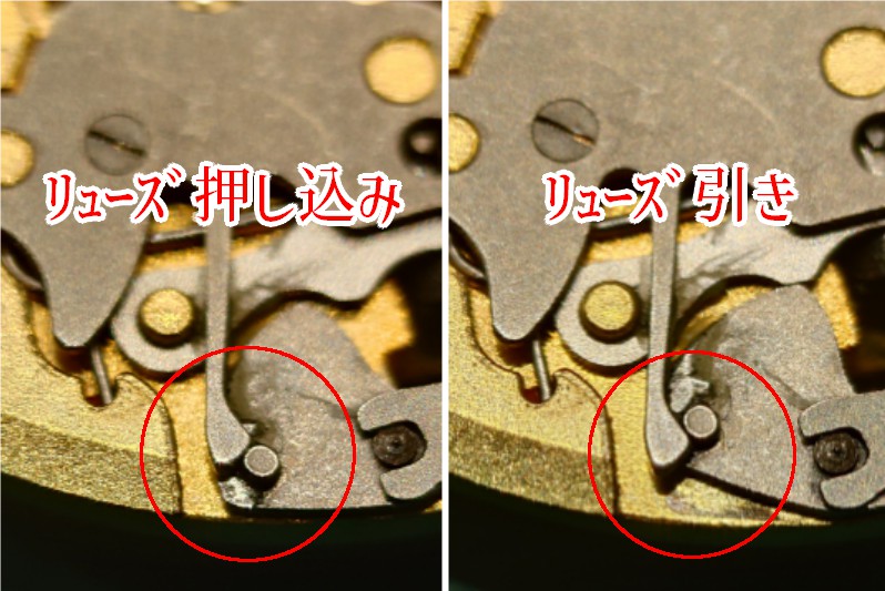 この部分が破損すると、時刻合わせをしようとリューズを0段から1段引きして針回しをしたときに、ちょっとした力で0段に戻ってしまい、不便になります。
